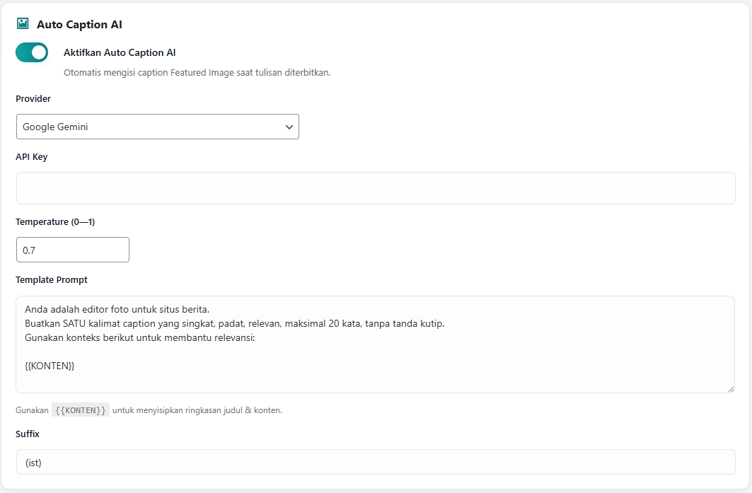 {{KONTEN}}yang akan digantikan secara dinamis dengan ringkasan judul dan konten artikel Anda.Contoh Prompt yang Efektif:Buatkan satu kalimat caption yang singkat dan menarik untuk gambar unggulan dari artikel berikut ini: {{KONTEN}} - Suffix: Teks tambahan yang akan diletakkan di akhir setiap caption yang dihasilkan AI. Contoh: Jika Anda mengisi Suffix dengan